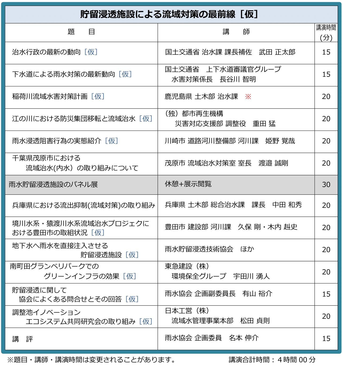 今回の技術講習会は「貯留浸透施設による流域対策の最前線」と題し、国土交通省をはじめ、特定都市河川に指定された流域の自治体の方々など様々な自治体の方々により、具体的な施策や現状の課題等についてお話しいただき、当協会の会員をはじめ、自治体の皆様、雨水貯留浸透に関わる企業の方々に役立つ事例や情報を紹介することとしました。